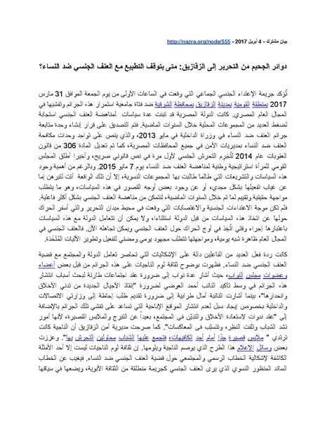 محتوى هذا الملف نصّه موجود في وثيقة:دوائر الجحيم من التحرير إلى الزقازيق: متى يتوقف التطبيع مع العنف الجنسي ضد النساء؟